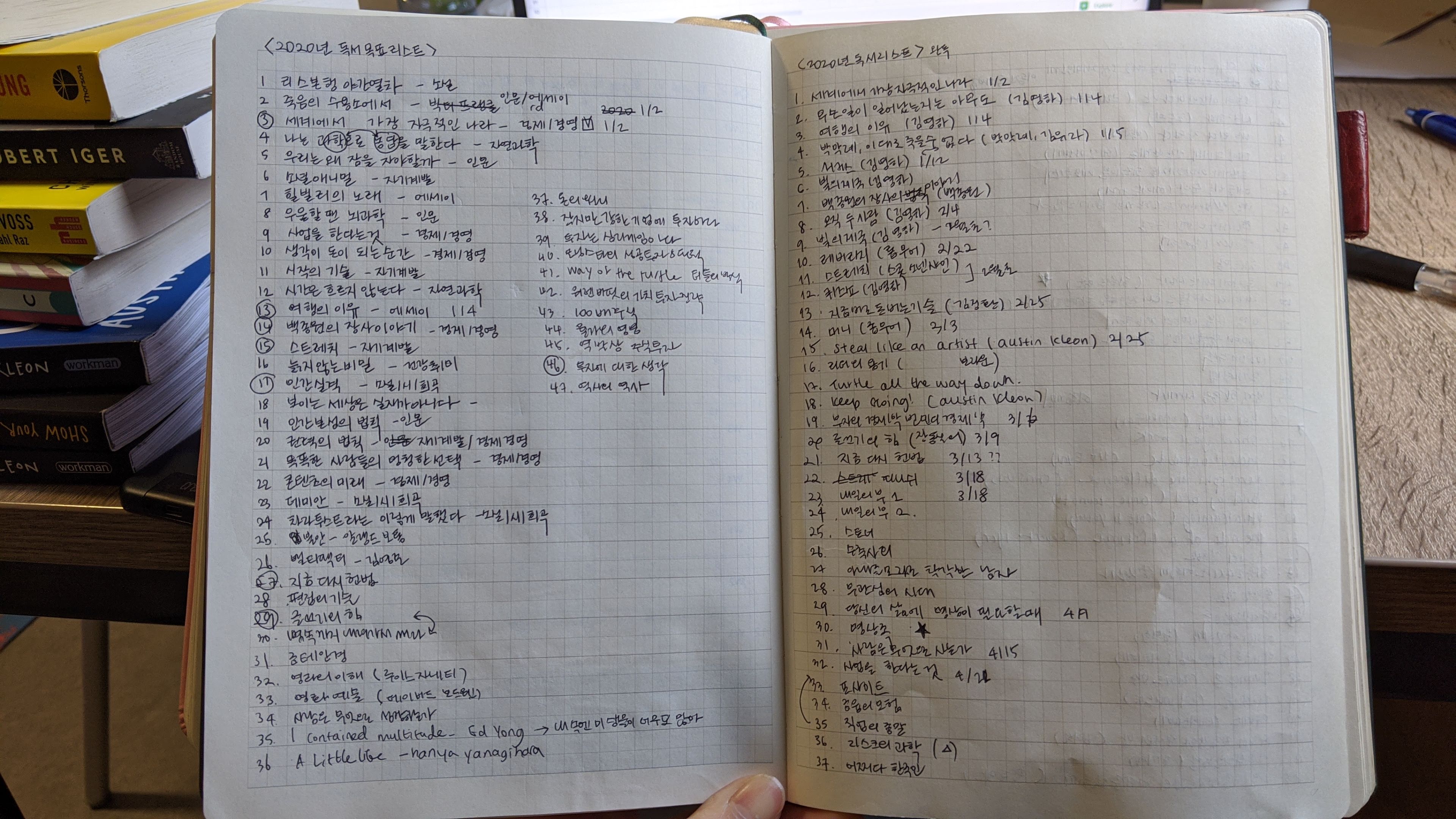 2020๋ ๋ ์ด์ ์ผ์ฃผ์ผ ๊ฐ๋ ๋จ์๋ค. ํ ํด๋ฅผ ์ ๋ฆฌํ๋ฉฐ ์ฌ ํ ํด ๋์ ์ฝ์๋ ์ฑ ๋ชฉ๋ก์ ์ ๋ฆฌํด๋ณธ๋ค.