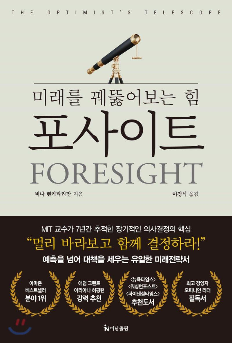 ์ ์๋ ๋ฏธ๋์ ๋ํ ๋๋ํ ์ ํ์ ํ๋ ํ๋จ์ ํฌ์ฌ์ดํธ(foresight)๋ผ๊ณ ํ๋ค. ํฌ์ฌ์ดํธ(Foresight)๋ฅผ ์ค์ฒํ๋ค๋ ๊ฒ์ ์ฐ๋ฆฌ๊ฐ ์๊ณ ์๋ ์ฌ์๋ค(๋ํ ์ฐ๋ฆฌ๊ฐ ์์ง ๋ชปํ๋ ๊ฒ๋ค)์ ํ๊ฐํด ๊ฐ๊ฐ์ ๊ฐ์ค์น๋ฅผ ๊ฒฐ์ ํ์ฌ ๋จ์ง ํ์ฌ์ ์ฐ๋ฆฌ๋ฟ ์๋๋ผ ๋ฏธ๋์ ์ฐ๋ฆฌ๋ฅผ ์ํด์๋ ์ต์์ ์ ํ์ ํ๋ ๊ฒ์ด๋ค.